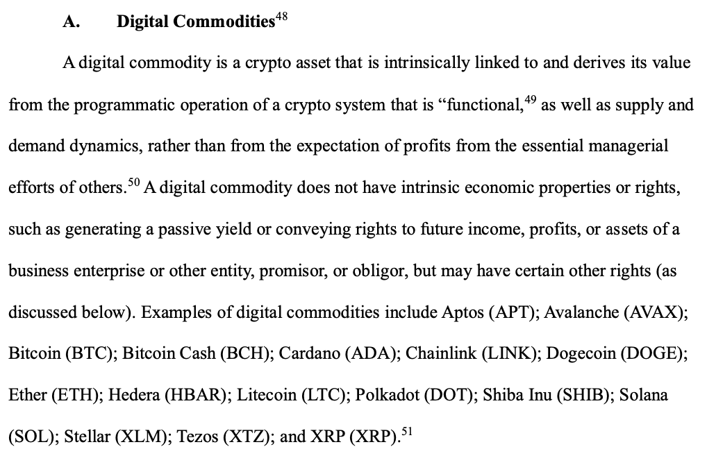 案例:文件明确列举了属于数字商品的资产,包括:Bitcoin (BTC), Ether (ETH), Solana (SOL), XRP (XRP), Cardano (ADA), Avalanche (AVAX), Dogecoin (DOGE), Polkadot (DOT) 等。