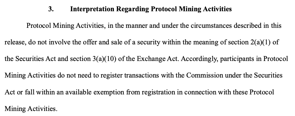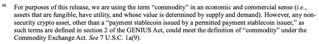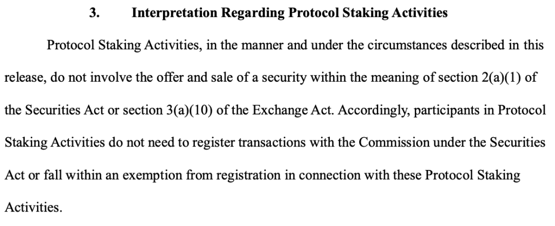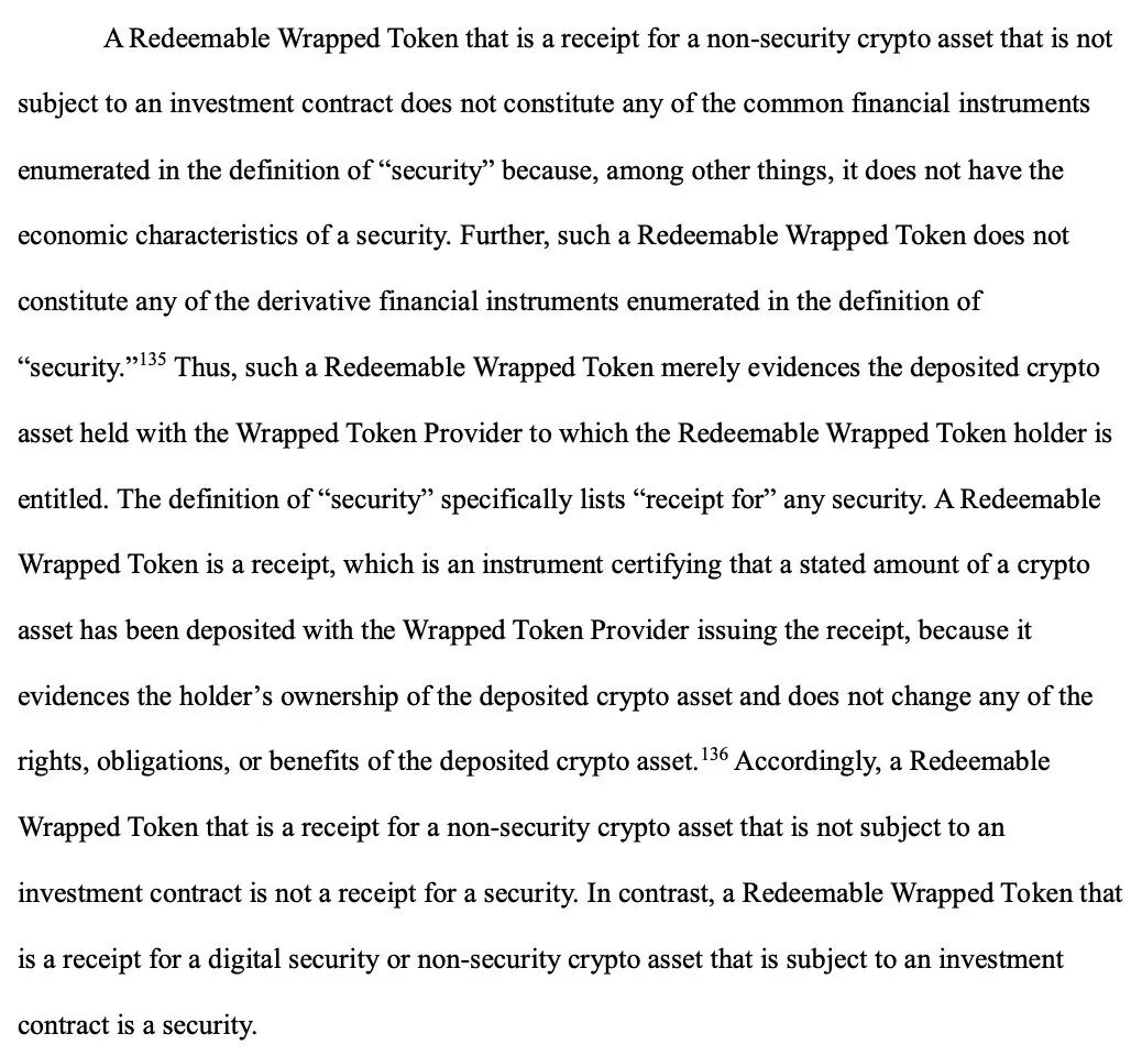 而本文件的核心目标,是为加密市场提供一套清晰的分类标准和法律解释。文件明确对加密资产进行分类,划清证券与非证券资产的边界,对常见链上活动(POW挖矿、POS质押、流动性质押、代币包装、空投)进行定性,并且表明监管的核心原则应当是“经济实质”而非资产的名称或形式。