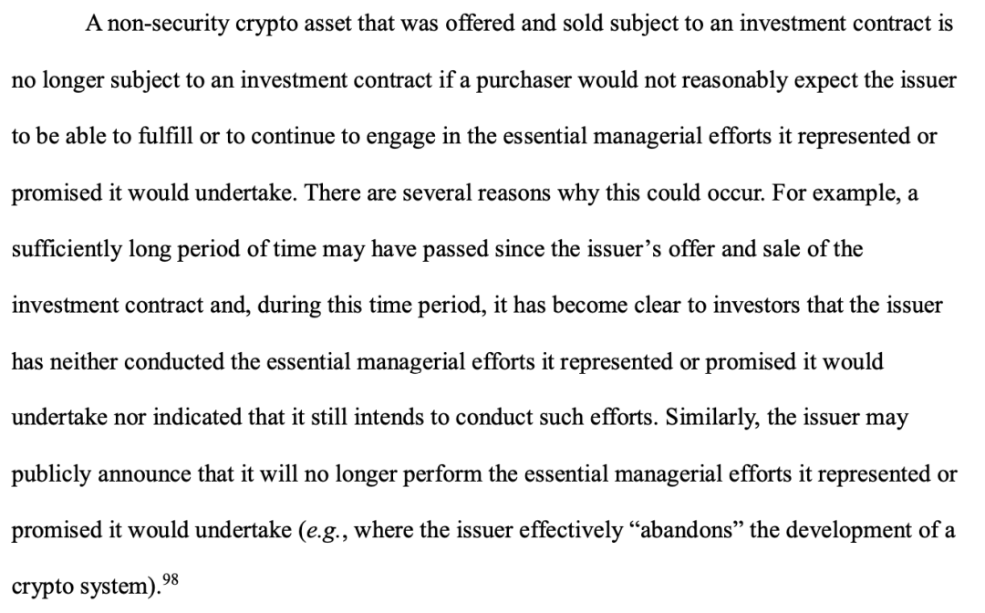 当发行方通过白皮书、社交媒体等渠道,明确承诺将开展必要的管理努力以提升资产价值,并据此诱导投资者购买时,非证券加密资产将被认定为"投资合同"的载体,需遵守证券监管要求。