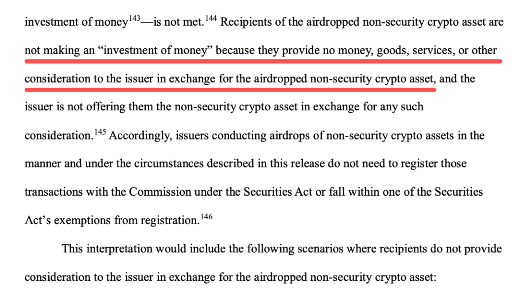 监管判定:若发行方向接收方空投非证券类加密资产,且接收方未向发行方支付货币、提供商品或服务、给予其他对价以换取该等空投资产,则该等非证券类加密资产不构成投资合同。