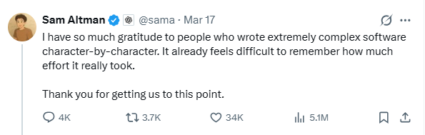 本周二,Altman在X上深情款款地发了这样一条帖子:
