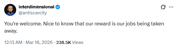 面对这种“端起碗吃饭,放下筷子砸锅”的发言,X上的网友们瞬间炸了。虽然有一些人直抒胸臆地表达愤怒:“不客气。很高兴知道我们得到的奖励是被抢走饭碗。”
