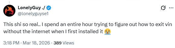 【打工人破防组】 网友 @lonelyguyse1 留下了时代的眼泪:“太真实了……我第一次装Vim的时候,没网的情况下花了整整一个小时才搞明白怎么退出。”