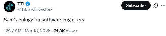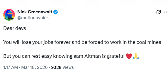 “亲爱的开发者们,你们将永远失去工作,并被迫去煤矿挖煤。但你们大可以高枕无忧了,因为知道Sam Altman对你们心存感激。❤️”
