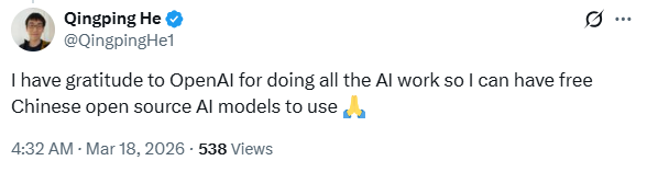 “我对OpenAI做出的所有AI工作充满感激,因为这样我就可以免费使用中国开源的AI模型了。”
