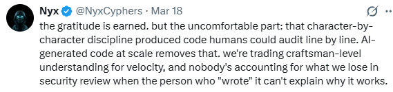 “这种感激是你应得的。但让人不安的部分在于:那种‘逐字逐句’的纪律性,产出的是人类可以逐行审查(audit)的代码。而如今大规模的AI生成代码抹杀了这一点。我们在用工匠级的理解力去换取(开发)速度,却没有人去计算我们到底失去了什么。”