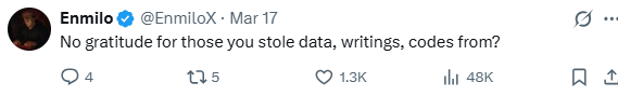 这或许正是引发众怒的深层原因:不仅是没有对那些被偷走数据、文章和代码的人表达歉意(正如网友 @EnmiloX 质问的那样),更是因为技术狂飙正在摧毁一种可控的、人类能完全掌握的工程师文化。