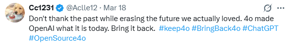 网友 @Aclle12 愤怒留言:“别光顾着感谢过去,却抹杀了我们真正热爱的未来。是4o让OpenAI有了今天的地位,把它还给我们!”