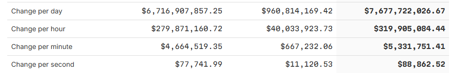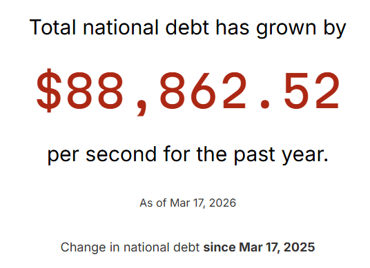 如果把时间线再缩短一些,就能很清楚看到,美国国债目前正以每秒8.88万美元的速度增加。