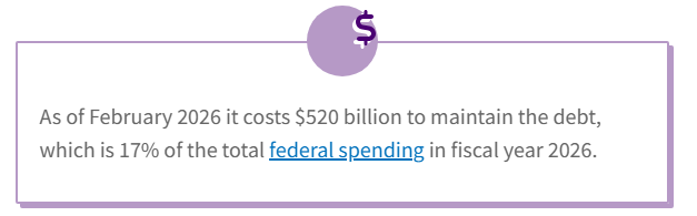 同时,债务本身产生的利息也在累积,2026年2月数据显示,维护国债的利息支出已达5200亿美元,占当年联邦总开支的17%。