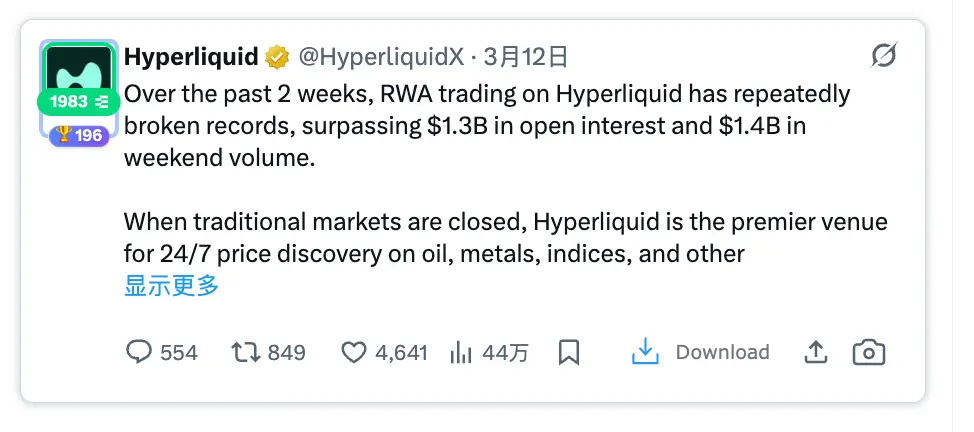2月28日那个周末就是最好的例子:美国空袭伊朗,市场情绪动荡,但传统交易所关着,原油、股指期货、白银、黄金你只能干等到周一开盘。而 Hyperliquid 上部署的 RWA Perp 则是真正的 24/7,全年无休。