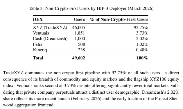 在近 5 万名因为传统资产才第一次进入 Hyperliquid 的用户中,TradeXYZ 贡献了 92.75%(46,005 人),Ventuals 3.73%(1,851 人),Dreamcash 2.02%(1,000 人),Felix 1.02%(508 人),Kinetiq 0.48%(238 人)。每个 HIP-3 Deployer 都在通过各自的前端和获客渠道,把不同画像的增量用户带进 Hyperliquid 生态。