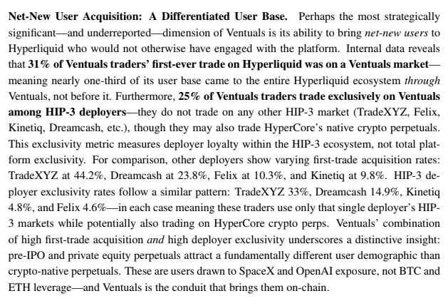 31% 的 Ventuals 用户,第一笔链上交易就是在 Ventuals 市场,接近三分之一的人是因为 Pre-IPO Perp 才进入整个 Hyperliquid 生态。25% 的用户只在 Ventuals 交易,不碰任何其他 HIP-3 Deployer。恰恰验证了我们之前说的,RWA其实是在吸引一个独立的用户群。