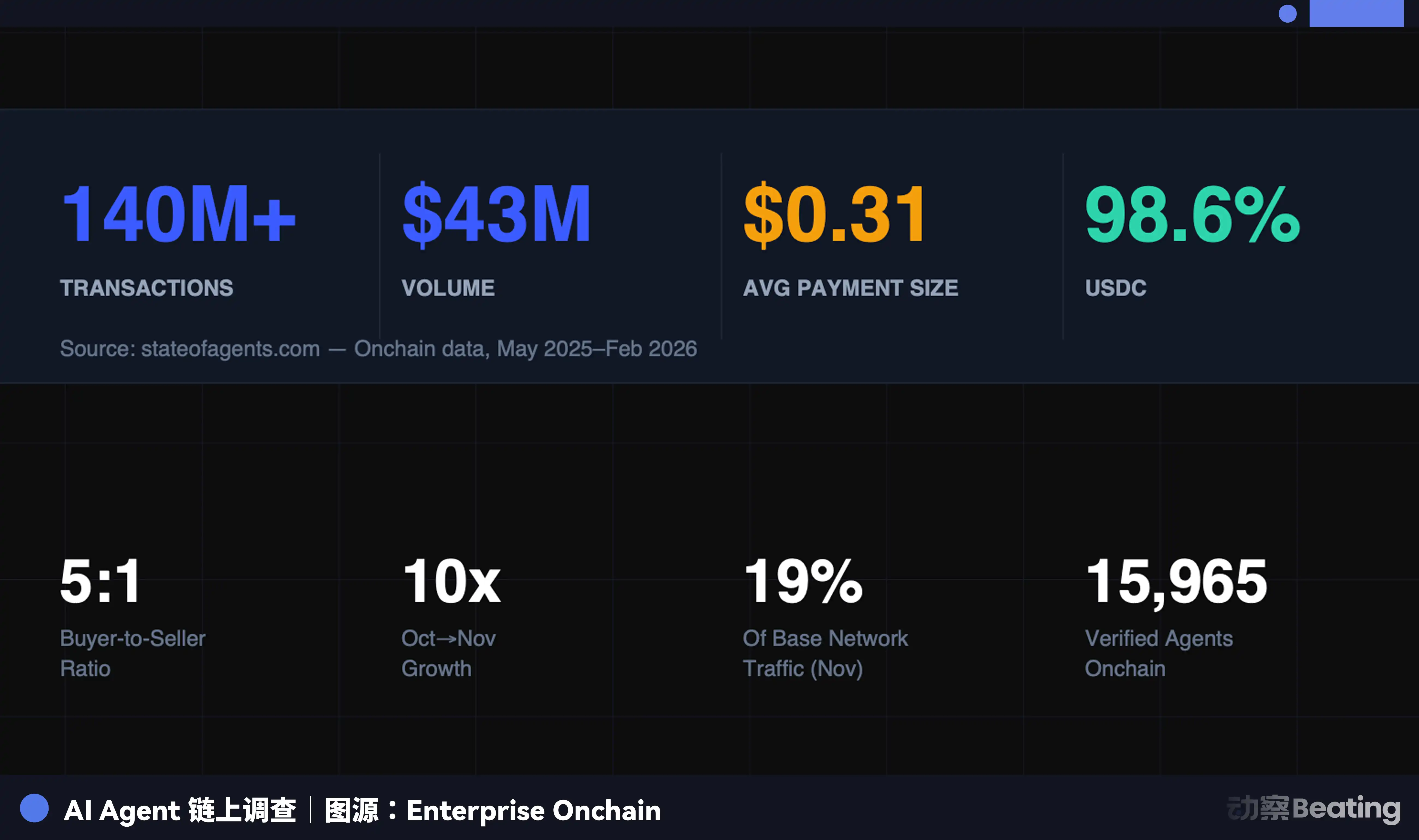 Here's some data released by Enterprise Onchain: In the past nine months, AI Agents completed 140 million payments, totaling $43 million, with 98.6% using USDC. The average transaction was $0.31, and there are now over 400,000 AI Agents with purchasing power.