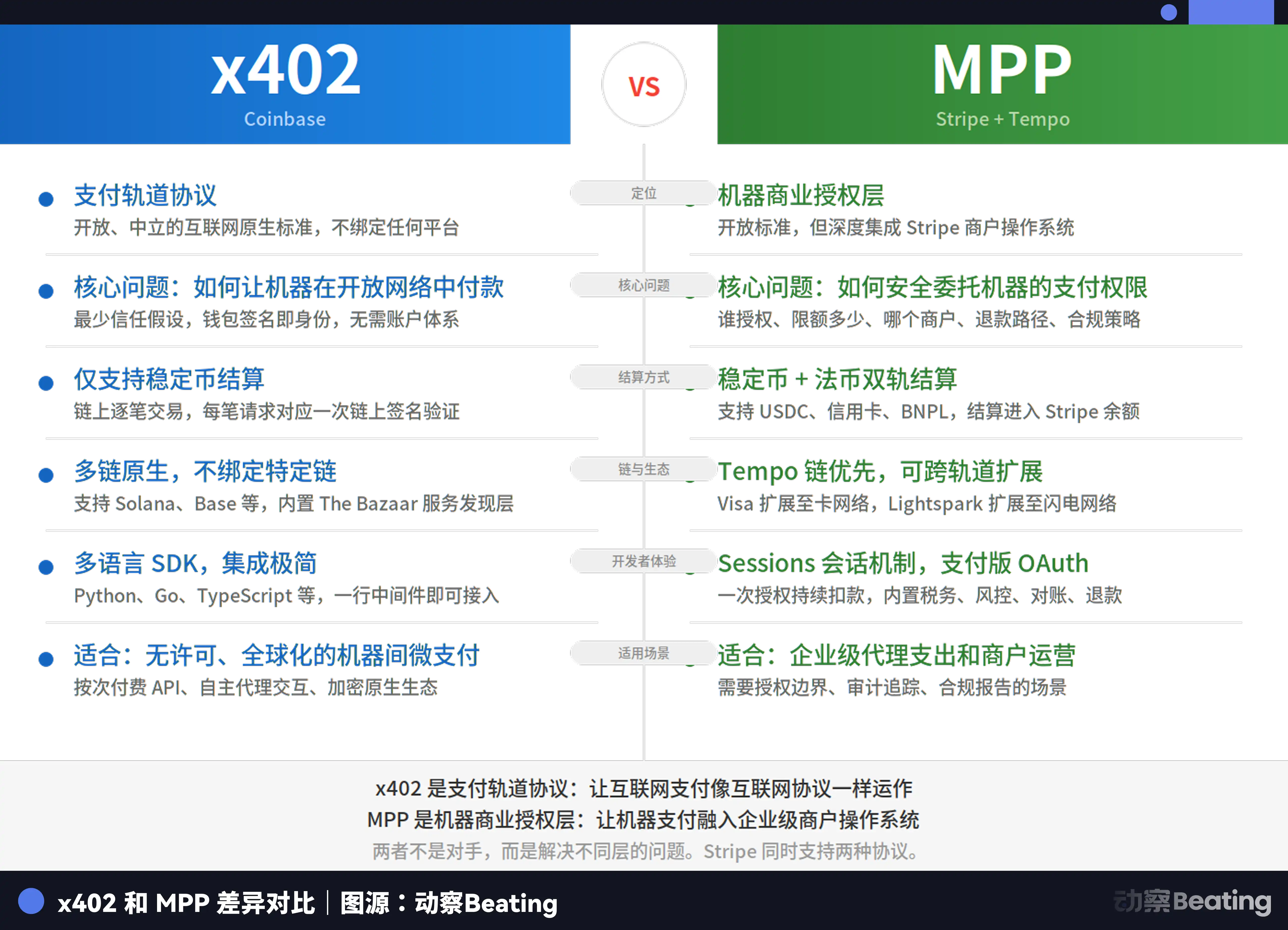 Google's newly launched UCP at the beginning of the year is compatible with all major standards and handles commercial transactions within the search and Gemini ecosystem. Stripe's MPP, launched alongside Tempo, also supports Mastercard and Visa system integration, handling machine-to-machine payments. Mastercard's Agent Pay handles auditable authorization for high-value transactions.