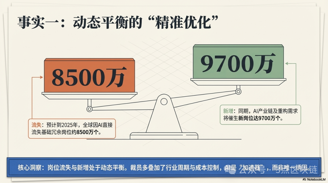 但这类裁员,始终是“人员优化”而非“批量清退”。一方面,企业裁撤的多是冗余的基础岗位,核心技术、管理、创意岗位不仅未被裁撤,反而需求稳中有升;另一方面,很多企业的裁员并非单纯因为AI,还叠加了行业周期、成本控制、业务调整等多重因素,AI只是加速了优化进程,并非唯一诱因。世界经济论坛数据显示,2025年全球因AI直接流失的岗位约8500万个,但同期AI催生的新岗位达9700万个,岗位流失与新增处于动态平衡状态,并未出现大规模失业缺口。