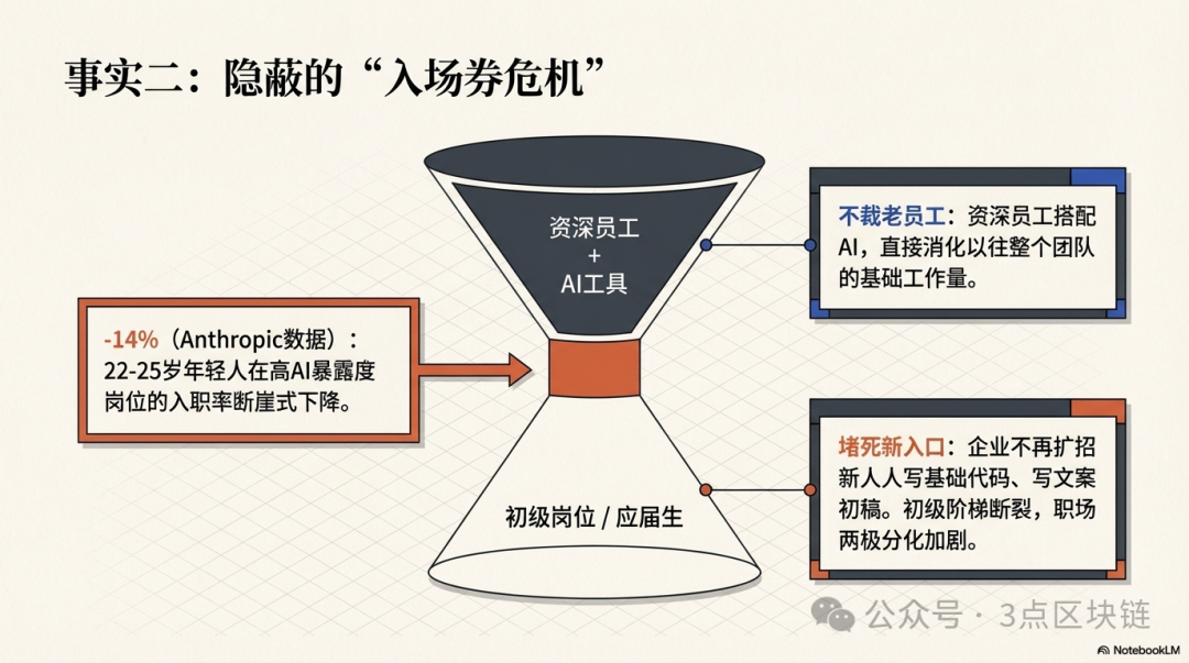 Anthropic发布的《AI对劳动力市场的影响》重磅报告,揭示了一个比直接裁员更残酷、更隐蔽的真相:AI现阶段很少大规模裁撤老员工,却在悄悄堵死年轻人、应届生的入行通道,这是当前AI就业冲击最容易被忽视的核心痛点。