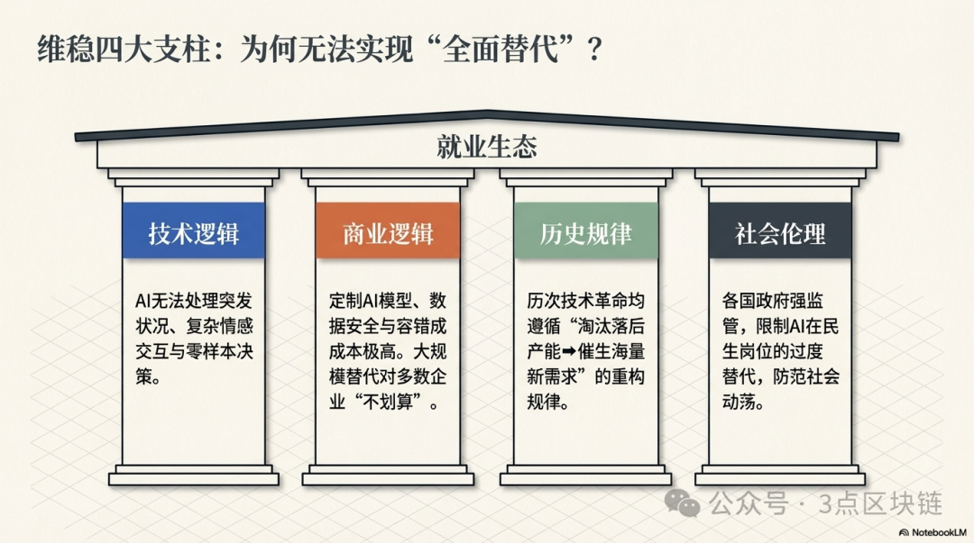 AI技术落地并非“零成本”,从模型采购、系统搭建、定制化调试,到员工培训、后期维护、数据安全保障,都需要巨额资金投入,从商业成本角度来看,企业大规模用AI替代人工,完全不划算,这是抑制大规模失业的重要商业壁垒。