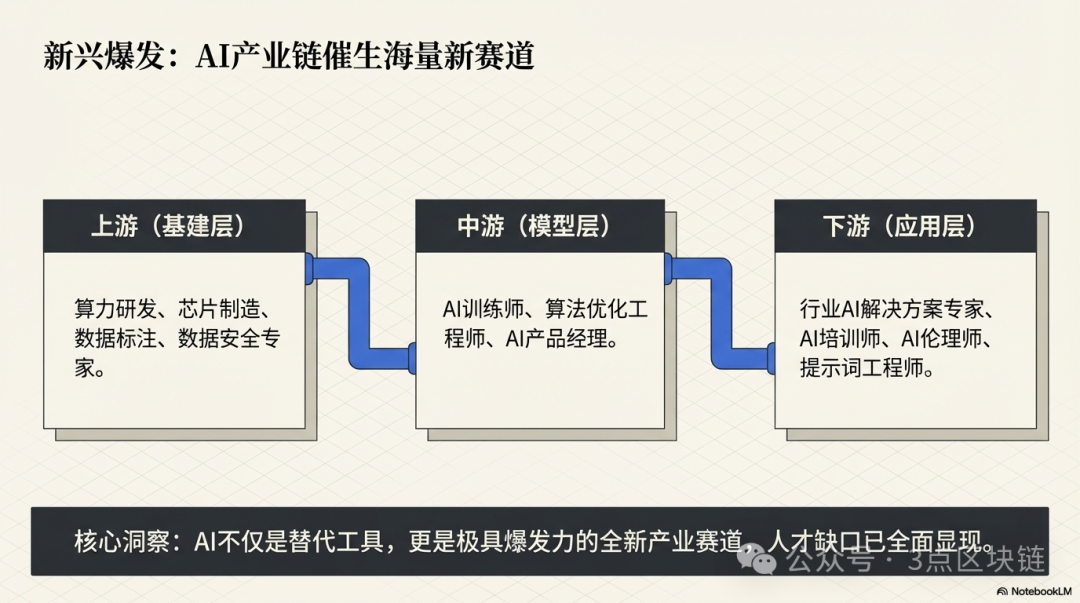 AI不仅是替代工具,更是全新的产业赛道,AI产业链的上下游,会催生海量新兴就业机会,弥补岗位流失缺口。