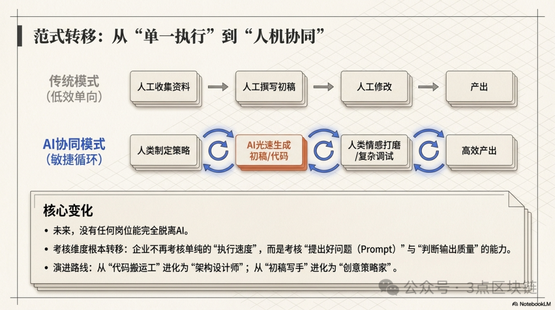 员工的核心价值不再是完成重复工作,而是驾驭AI工具、处理AI无法完成的复杂任务、进行决策与创意输出、维护人际协作。比如程序员,未来的核心能力不是写基础代码,而是用AI提升效率,专注架构设计、系统优化、复杂问题调试;比如文案,核心能力不是写初稿,而是用AI生成内容,再进行策略优化、情感打磨、创意升华。企业招聘标准也会彻底改变,不再看重单纯的执行能力,而是看重“AI使用能力+核心专业能力+复合素养”的综合实力。