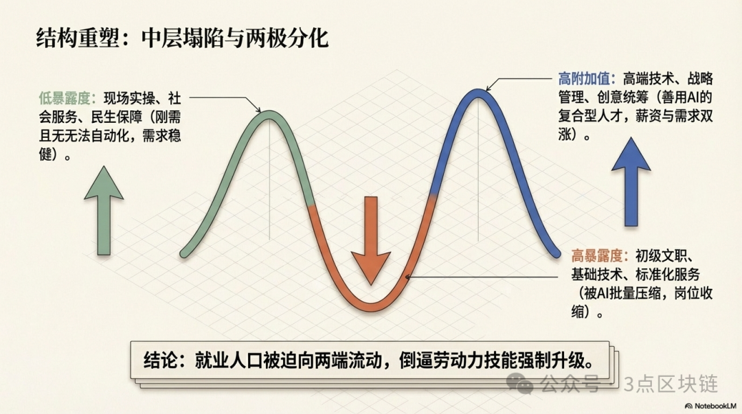 AI会进一步加剧就业市场的两极分化:高端核心岗位(善用AI、具备复合能力)需求增加、薪资上涨;低端基础岗位(重复劳动、低技能)需求缩减、薪资承压;中间过渡型岗位逐步收缩。