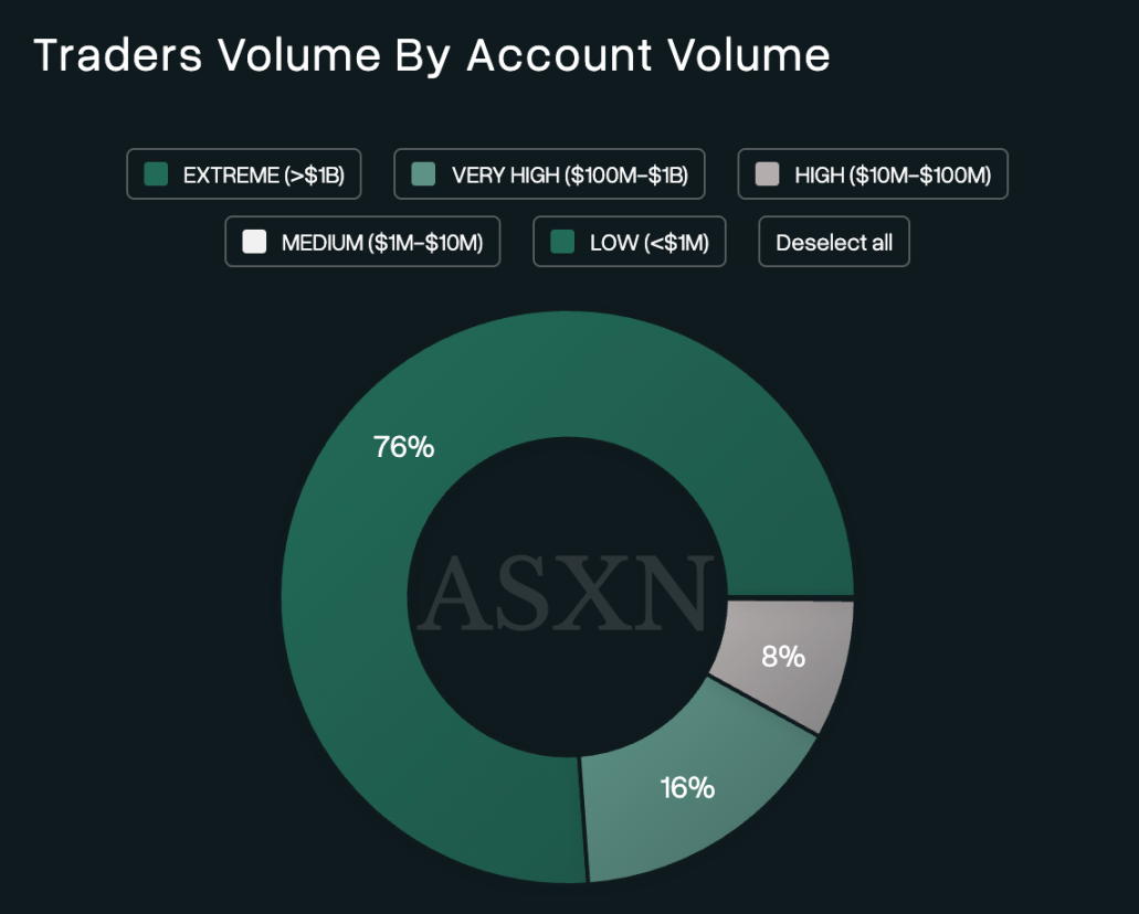 据加密资产研究商 ASXN 统计的数据,Hyperliquid 总交易额超过了 8 万亿美元(其他数据统计显示为 4 万亿,可能 ASXN 将交易双方的量进行了重复计算),其中交易量超过 10 亿美元的账户拿下了总交易量的 76%,交易量在 1 亿到 10 亿美元的账户占了总交易量的 16%。
