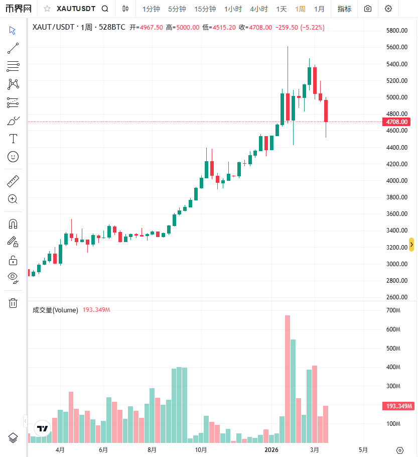 过去一年这个市场涨得很快。2025年初,代币化黄金的总市值才13亿美元,到了年底就超过44亿,全年涨幅177%。黄金本身价格一路上涨是主要原因,链上避险需求的增加也推了一把。