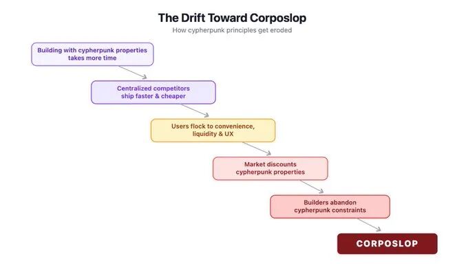 Cypherpunk 原则,如开源、抗审查性、隐私和可信退出,是专门设计来防止系统偏向产生 corposlop 的那种激励机制。问题在于,构建具有这些属性的系统更困难,市场往往不会奖励构建它们所需的额外努力。随着时间的推移,这产生了一种强大的激励,促使人们完全放弃 cypherpunk 的约束,这就是系统如何逐渐偏向产生 corposlop 的锁定和提取的相同模式。