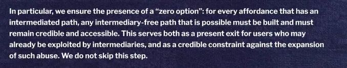 大多数人认为竞争能让公司保持诚实。实际上,让系统保持诚实的是用户必须能够离开。当退出是可信的时,中介机构就不能随意修改规则或无限制地提取价值,而不用担心用户会简单地离开。当退出消失时,系统会缓慢地走向控制和提取,这种过程往往非常缓慢,以至于用户甚至没有意识到正在发生什么。大多数人一生中的数字生活都在那些他们一无所有且无法离开的平台内度过,因此缺乏退出几乎不被视为一个问题。这只是感觉很正常。这就是为什么市场始终低估了它。由于市场对退出投入不足,受长期激励机制约束的机构最能捍卫它。这正是以太坊基金会可以为生态系统发挥的作用。作为一个非营利组织,专注于以太坊的长期愿景,它可以专注于保护市场最不可能自行捍卫的属性。以太坊基金会的新使命 使用“零选项”一词描述了这一想法。该使命指出,任何建立在以太坊上的系统都必须保留一条可信路径,用户可以通过该路径与网络交互,而无需依赖中介机构。