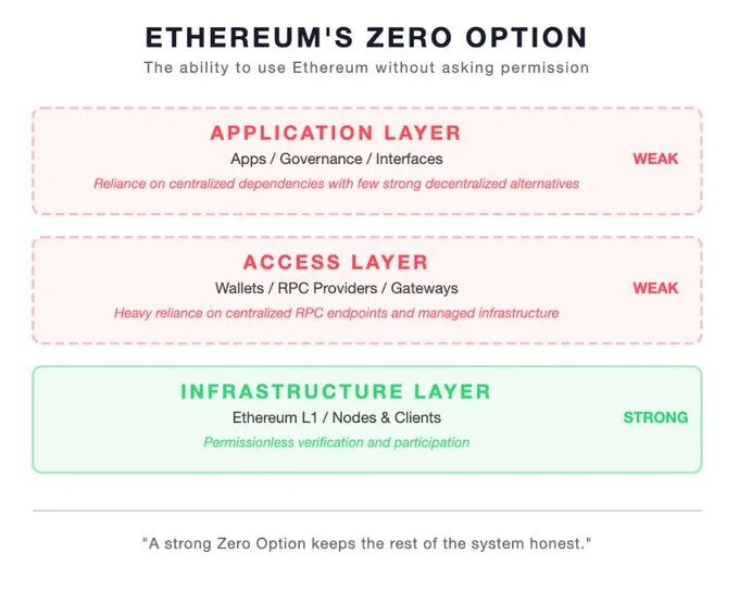 以太坊实际上在基础设施层面保护零选项方面做得非常出色。核心开发者、研究人员、客户端团队、以太坊基金会以及更广泛的社区多年来一直致力于确保任何人都能验证链。但访问层和应用层明确的捍卫者要少得多。随着以太坊从一个研究项目走向现实世界的采用,这些层保持相同的可信退出变得越来越重要。
