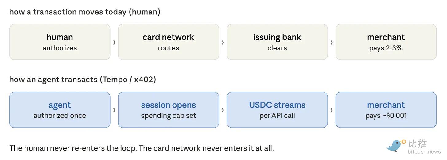 一个完成研究任务的智能体可能会在一次会话中调用数百次专门的数据 API。每次调用的费用仅为几分钱。一周下来,这些调用可能为服务开发商产生 40 美元的收入。卡组织网络无法处理这种交易——最低交易成本(经济模型)行不通,商户入驻流程行不通,费率结构也行不通。这类商业从一开始就不可能在 Visa 的路径上运行。它需要全新的东西,而 x402、Nanopayments 和 Tempo 正在构建它。