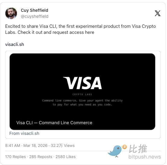 “很高兴分享 Visa CLI,这是 Visa Crypto Labs 的首个实验性产品。在这里查看并申请访问权限:visacli.sh”