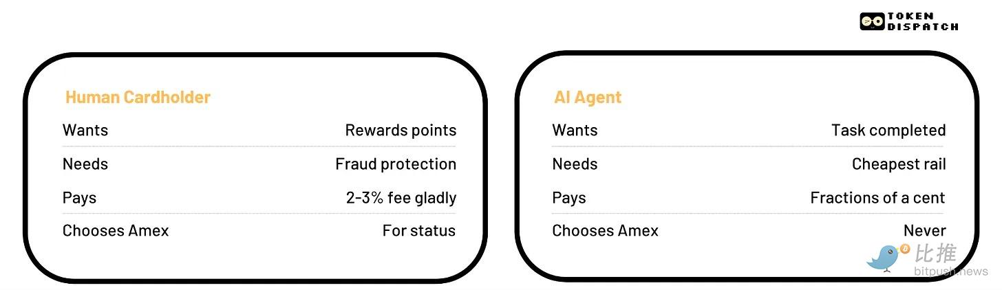 它不攒积分。它不会因为有欺诈保护就感到更安全。它不向往黑卡。它只有一个指令:完成任务。而当任务涉及支付时,智能体会去做人类永远懒得算的那道数学题——最低廉的路径、最快的结算、最低的手续费。每一次,自动地,不带任何感情。