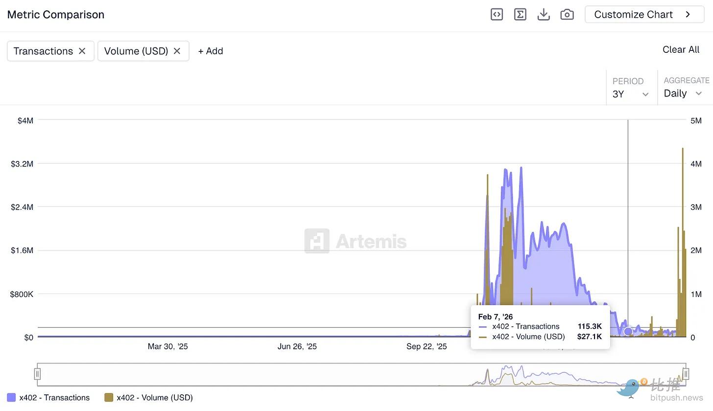 尽管围绕 x402 协议的生态估值约为 70 亿美元,但链上数据显示,上周该协议每天的处理金额仅为 2.8 万美元左右,其中大部分来自测试而非真正的商业交易。这个数字与 Visa 每天处理的金额完全不在一个量级。