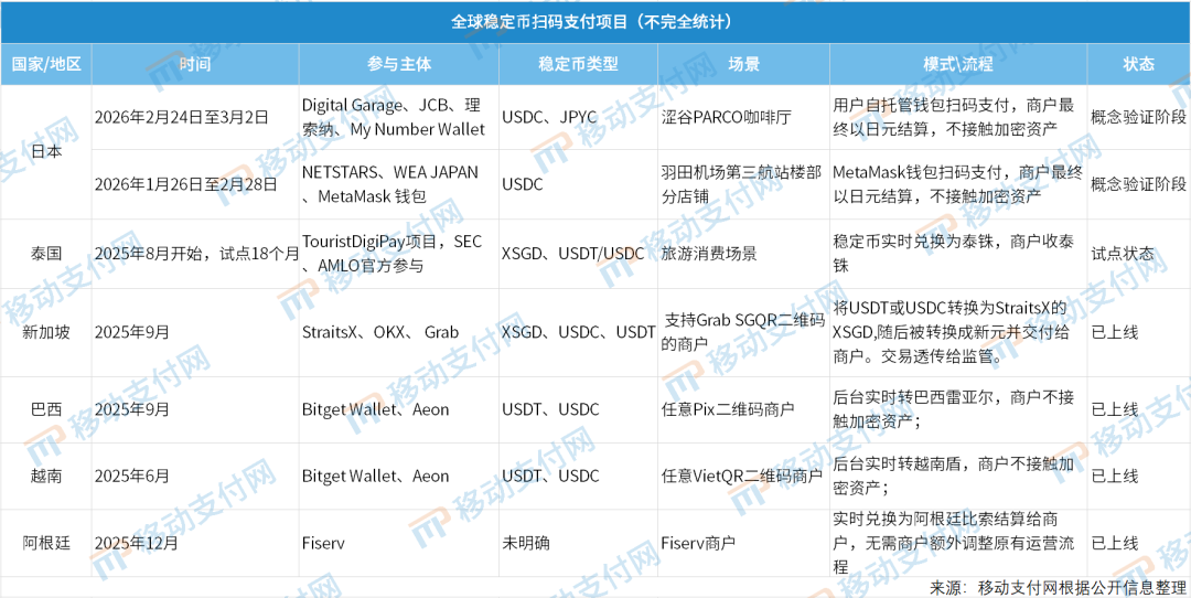 日本作为一个稳定币相关立法较早,但落地相对比较保守的国家,在2026年开始,几大商业机构开始进行稳定币扫码支付的概念验证试点,整体的可适用范围较小,且有时间限制。移动支付网从业界了解到,日本官方对此保持旁观状态,创汇成为了场景方愿意配合试点的一大重要出发点。