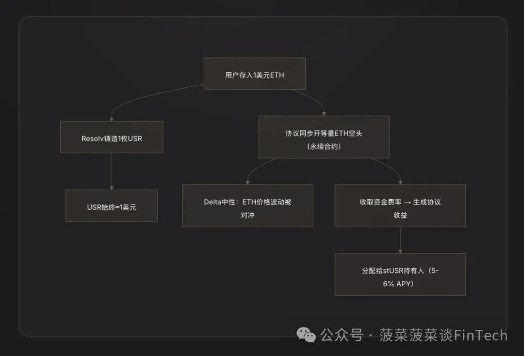逻辑如下:当你存入1美元的ETH铸造1枚USR时,Resolv协议同步在永续合约市场开等量的ETH空头仓位。ETH涨了,现货赚钱,合约亏钱;ETH跌了,合约赚钱,现货亏钱——两相抵消,净资产始终约等于1美元。这使得USR与ETH价格脱钩,同时又保持了1:1的美元锚定[注2]。