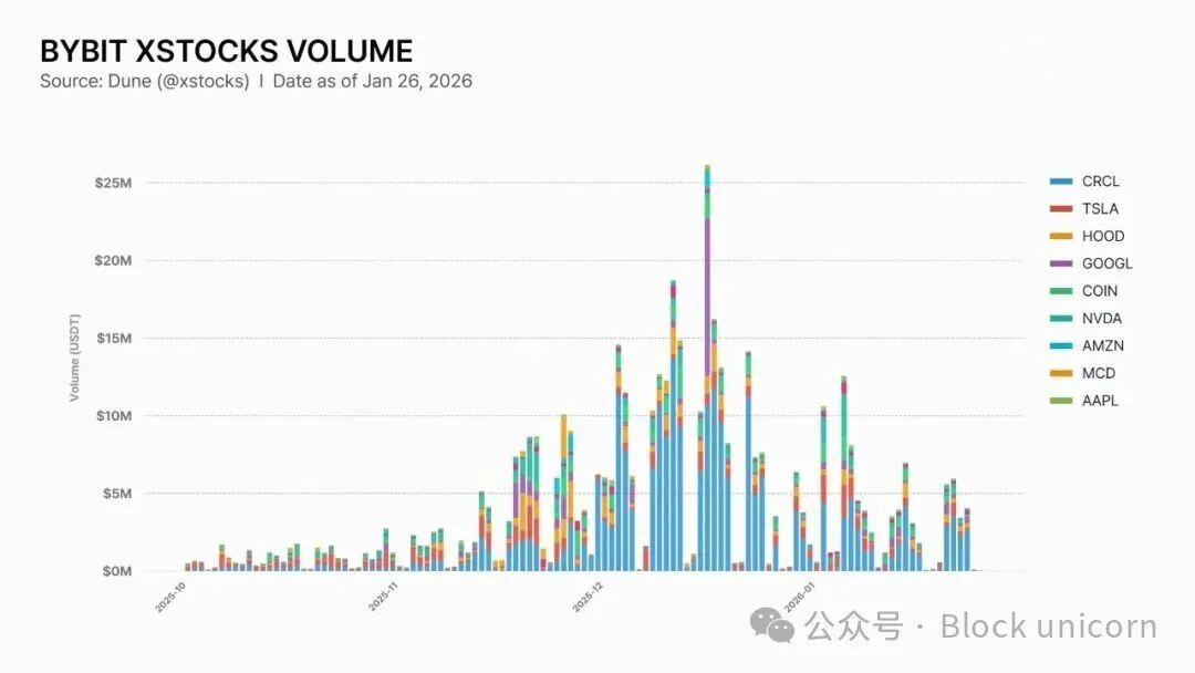 迄今为止,Bybit 上的 xStocks 累计交易量已达约 5.5 亿美元,周末非交易时段也保持稳定活跃。