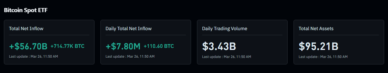 ETF 资金流向是观察机构情绪最直观的窗口。3月25日(美东时间)数据显示,比特币现货 ETF 单日净流入780.69万美元,以太坊现货 ETF 单日净流出850.74万美元——以太坊 ETF 已连续第6个交易日净流出。