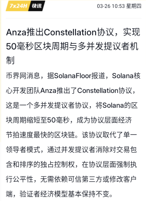 同日,Solana核心开发团队Anza正式推出Constellation协议——一个多并发提议者协议,将Solana的区块周期缩短至50毫秒,一举成为协议层面经济节拍速度最快的区块链。此前的Solana区块时间为400毫秒,业界对比特币10分钟、以太坊12秒的认知被彻底颠覆。
