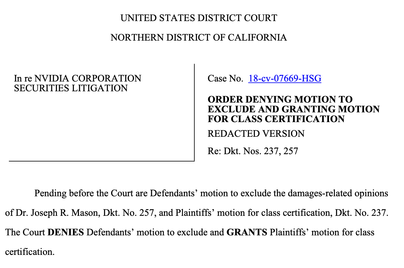 该诉讼最初由投资者于2018年提起,2021年曾被驳回。随后上诉重审,英伟达向美国最高法院的上诉未获受理,如今案件正式获得集体诉讼批准。