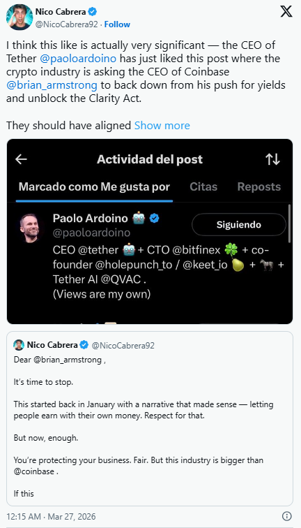 加密货币评论员尼科·卡布雷拉最近突出显示Paolo Ardoino 点赞了一篇帖子,呼吁 Brian Armstrong 停止推动稳定币收益率,并停止阻碍《CLARITY 法案》的实施。