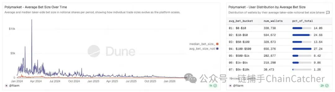 另外,在这一波规范背后,存在 Polymarket 无法回避的矛盾:Polymarket 的流动性并非天然形成。根据链上数据显示,平台上 80% 的用户单次投注金额不足 500 美元,过去一个月的平均单次投注金额仅约 100 美金上下,因此真正支撑起市场深度的,是极少数的大型交易者与流动性提供者。