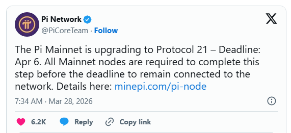 尽管如此,核心团队在几个小时前的一篇博文中指出,Pi Network 主网已开始升级到协议21,截止日期为4月6日。与以往所有此类更新一样,他们敦促所有主网节点“在截止日期前完成此步骤,以保持与网络的连接”。