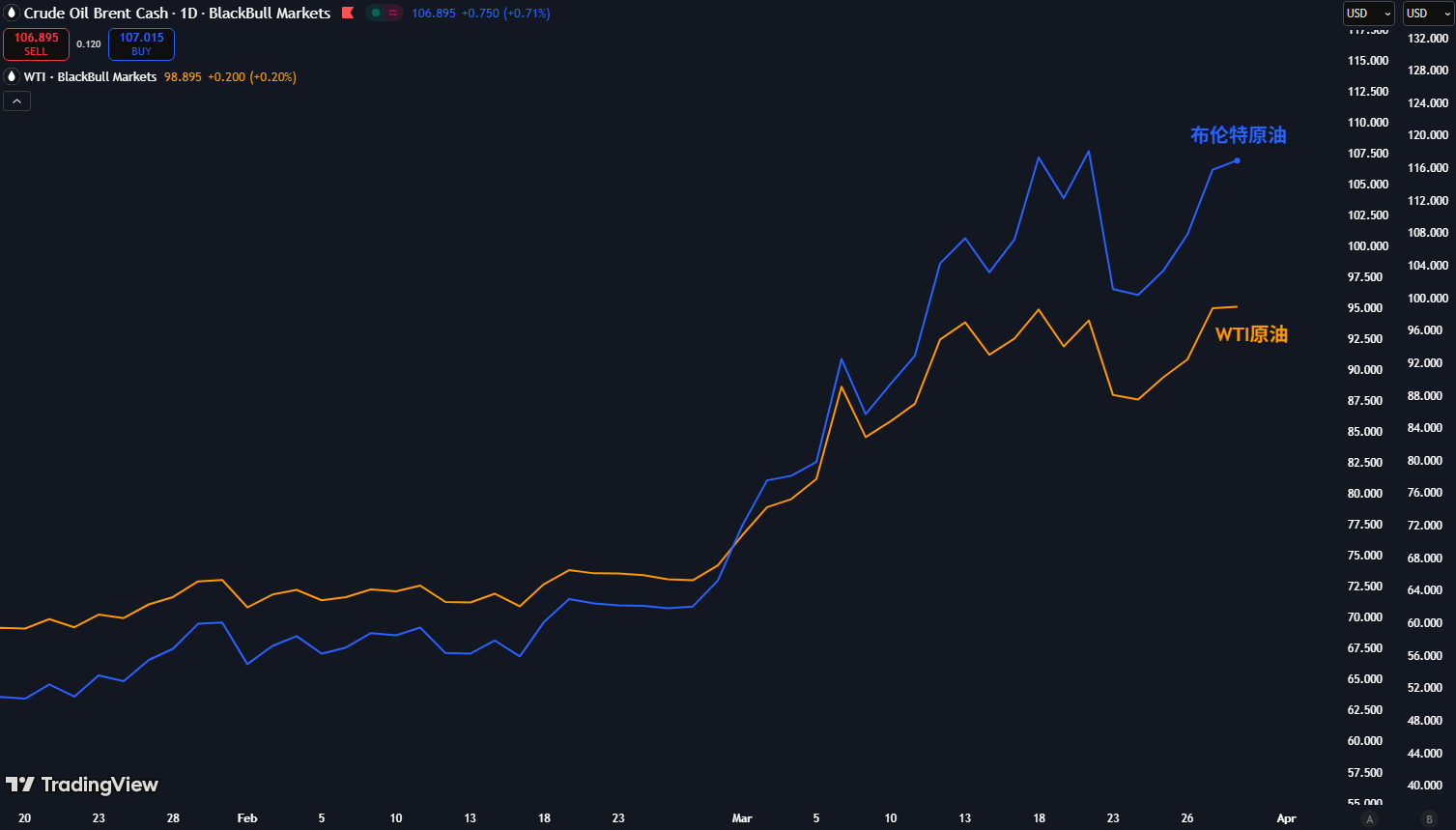 全球原油价格在2026年3月逼近110美元——布伦特原油已突破110美元,WTI也站上了100美元关口!