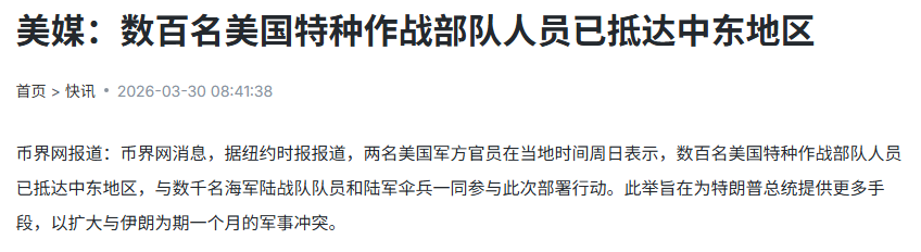 根据3月30日币界网披露的消息,美国最新的军事动向显示:一支规模不小的美军特种作战部队已经正式达到中东地区,总人数达到数百人。