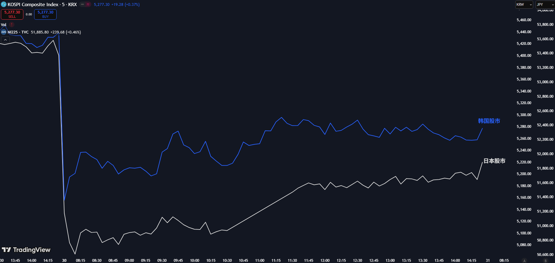 韩国股市开盘一度暴跌超过4%,日本股市开盘暴跌一度超过5%。