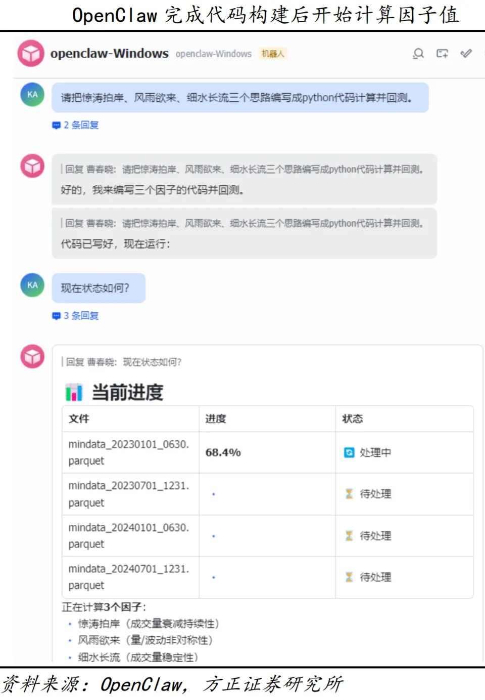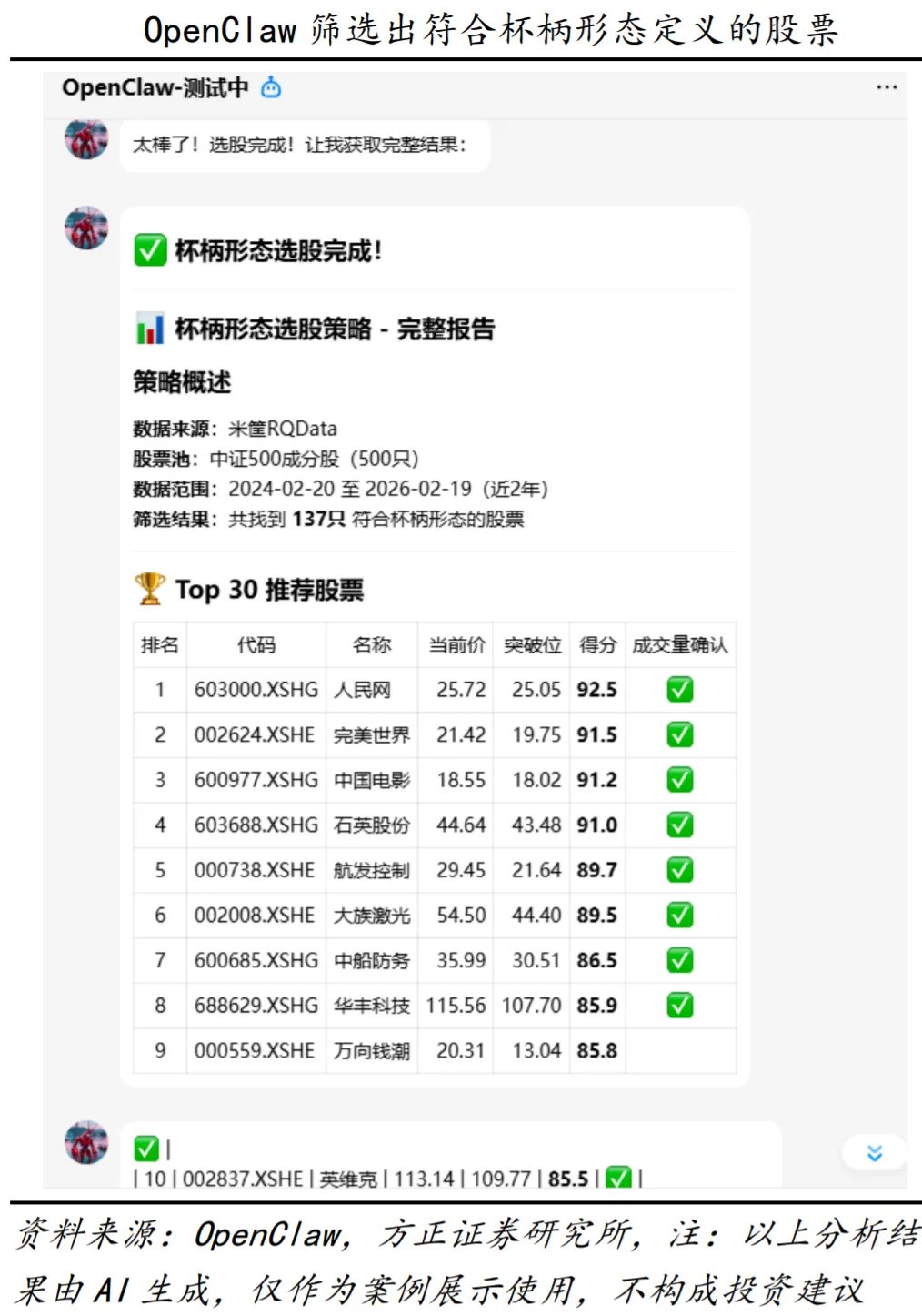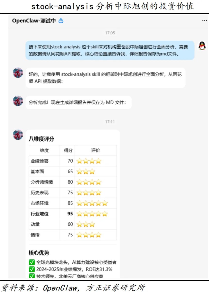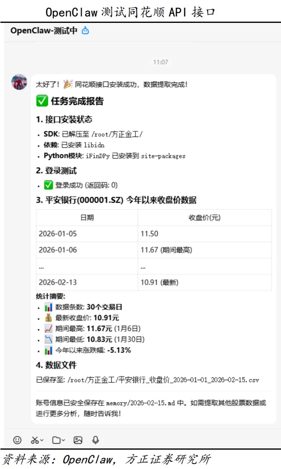 方正证券2026年2月21日报告显示,曾利用OpenClaw成功测试同花顺API接口