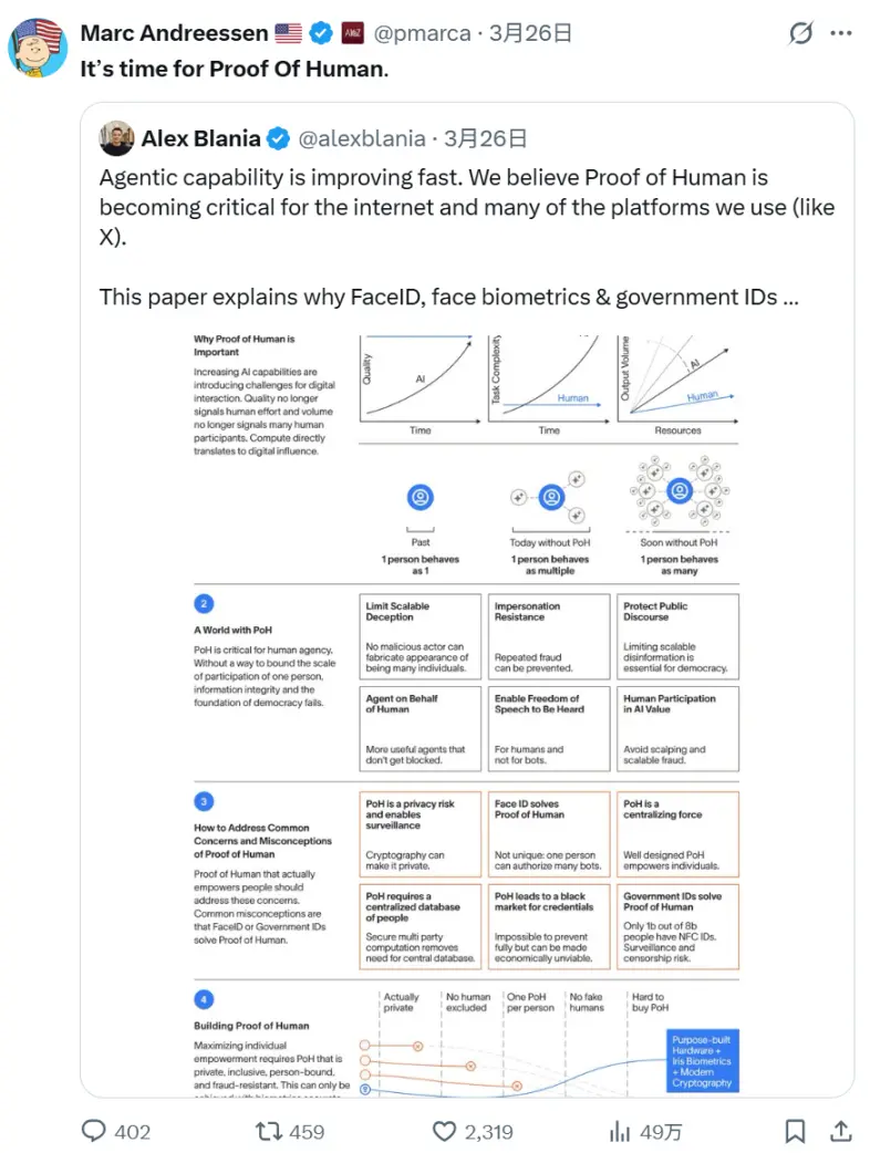 3 月 26 日,a16z 联合创始人马克·安德森在 X 平台转发了这篇论文,并附上简短却极具分量的评论:是时候人类证明了。