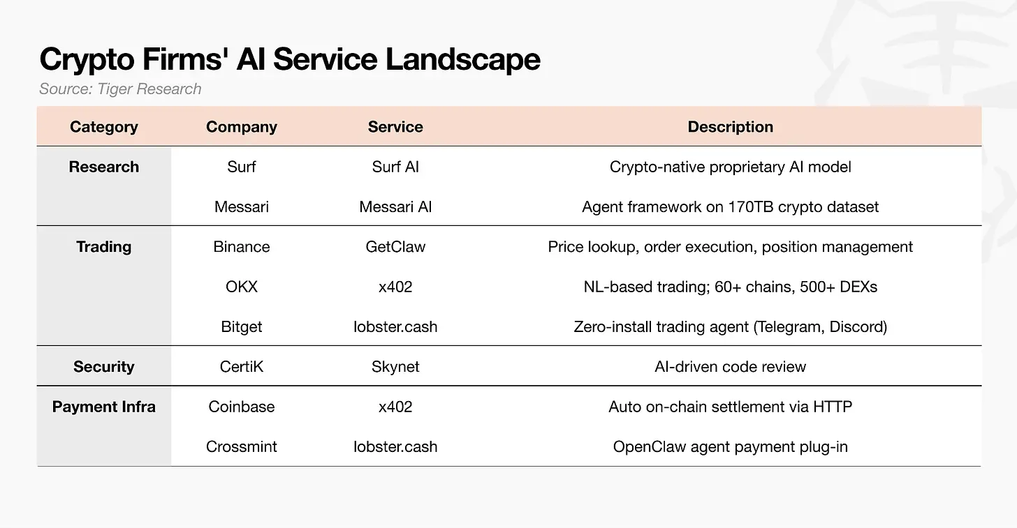 本报告由 Tiger Research 撰写,加密货币公司普遍面临“错失恐惧症”(FOMO)。从交易所到安全公司,它们都在竞相推出人工智能驱动的服务。我们将探讨它们为何选择此时采取行动。