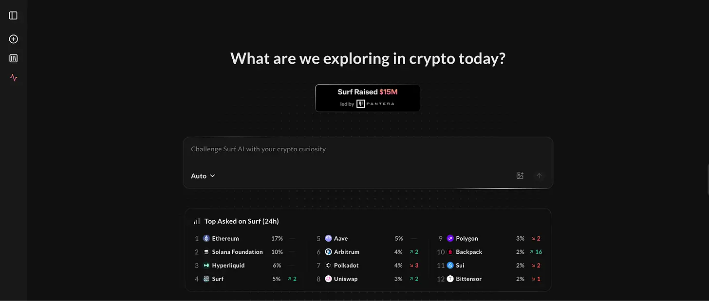 Surf 等项目通过提供加密货币专用的 AI 研究工具来解决这个问题,这些工具可以整合分散的数据源。在所有加密货币 AI 应用场景中,研究对普通用户的入门门槛最低,无需任何编程或交易方面的专业知识。